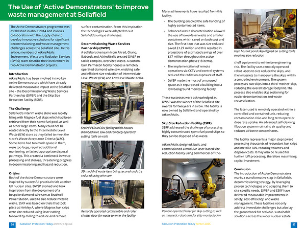 The Active Demonstrators programme was established in about 2014 and involves collaboration with the supply chain to develop innovative solutions for significant decommissioning and waste management challenges across the Sellafield site. In this article, members of AtkinsRéalis Environment, Waste and Radiation Services( EWRS) team describe their involvement in two Active Demonstrator projects.
