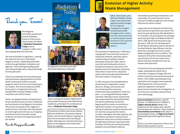 Editor, Trevor Jones, and SRP Past President, Sheila Liddle, have experienced significant policy changes for the long-term management of Higher Activity Waste( HAW) throughout their careers, from the international ban on sea dumping to several iterations in the search for land-based disposal options.